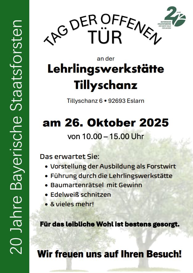 Am 26. Oktober 2025 von 10.00 – 15.00 Uhr laden die Bayerischen Staatsforsten herzlich nach Eslarn (Tillyschanz 6) ein.